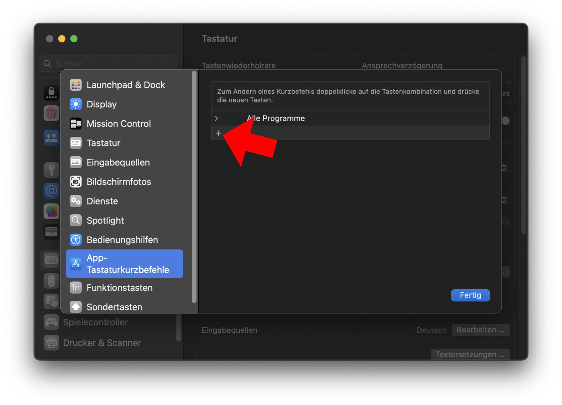 - In dessen Übersicht wählt ihr links App-Tastaturkurzbefehle aus