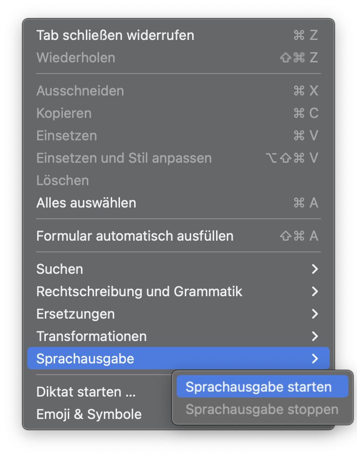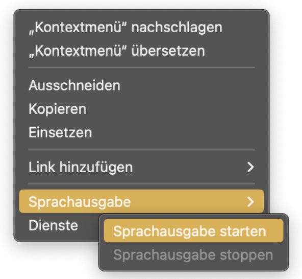 - Wählt aus dem erscheinenden Kontextmenü „Sprachausgabe“ und „Sprachausgabe starten“ aus