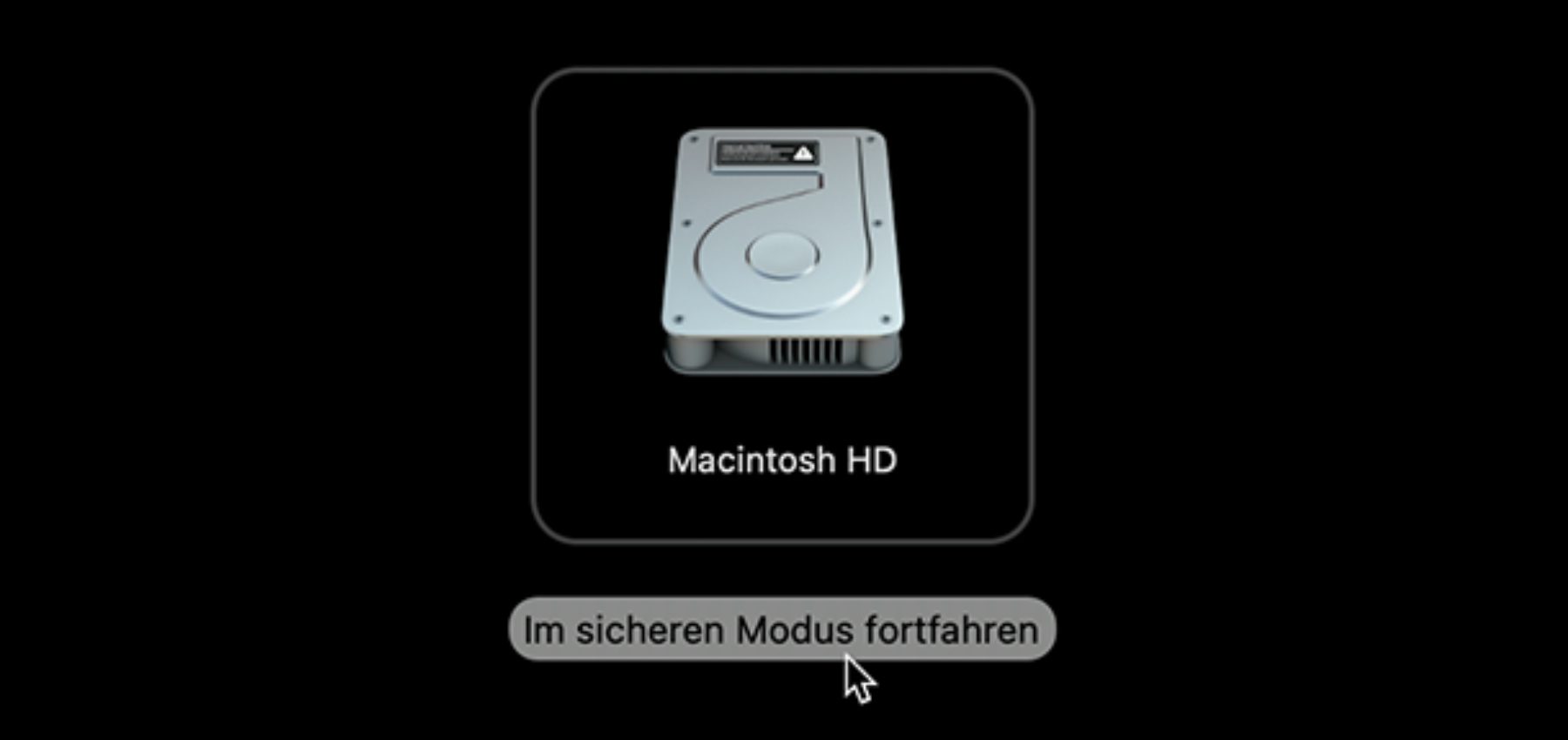 - M-Chip Mac: Den Mac ausschalten und dann die Einschalt-Taste gedrückt halten, bis angezeigt wird, dass die Startoptionen geladen werden. Das Startvolume (Macintosh HD) anklicken, die Umschalttaste drücken und unter dem Volume auf „Im sicheren Modus fortfahren“ klicken. Die Umschalttaste loslassen und beim Anmeldefenster anmelden. Eventuell wird auch hier das Passwort zweimal abgefragt.