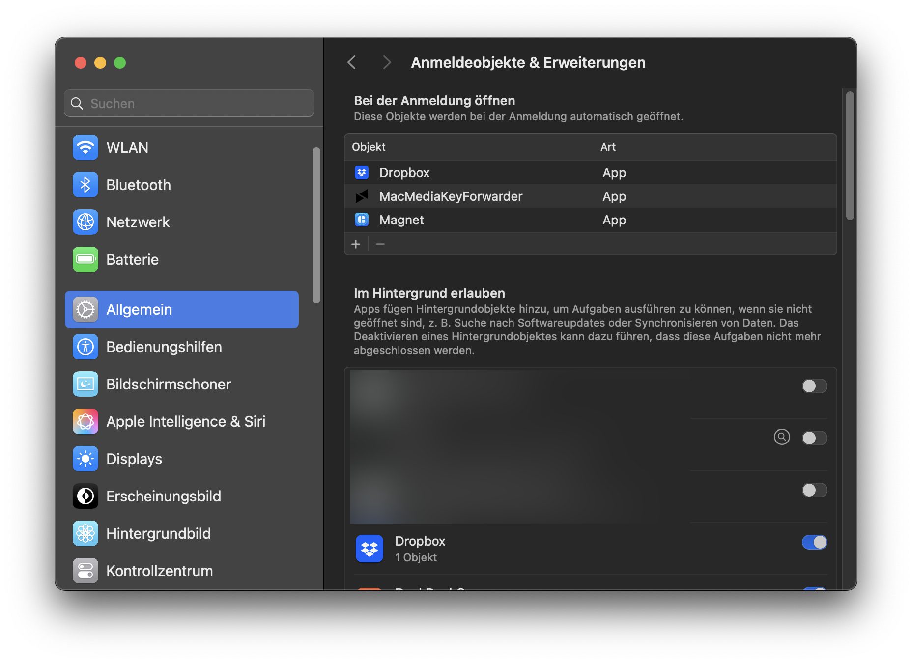 Als erstes kann also in den Systemeinstellungen der Bereich Allgemein -> Anmeldeobjekte & Erweiterungen aufgesucht werden. Dort können dann bei der Anmeldung automatisch startende Apps aus der entsprechenden Liste entfernt sowie im Hintergrund laufende Apps deaktiviert werden.