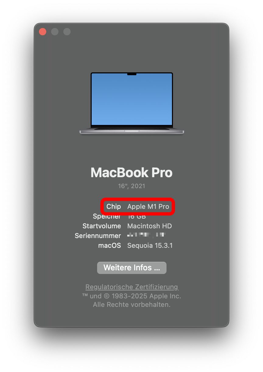 Treten die Probleme auch nach dem Neustart des Mac auf, dann kann für die Fehlersuche der abgesicherte Modus (Mac Safe Mode) genutzt werden. Dieser wird auf verschiedenen Mac-Modellen unterschiedlich aufgerufen. Ausschlaggebend ist dabei, ob der Computer einen Intel-Prozessor hat oder ob der Apple Silicon (M-Chip) zum Einsatz kommt. Ob ein Intel-Prozessor oder ein M-Chip verbaut ist, bekommt man über Apple-Logo -> Über diesen Mac heraus.
