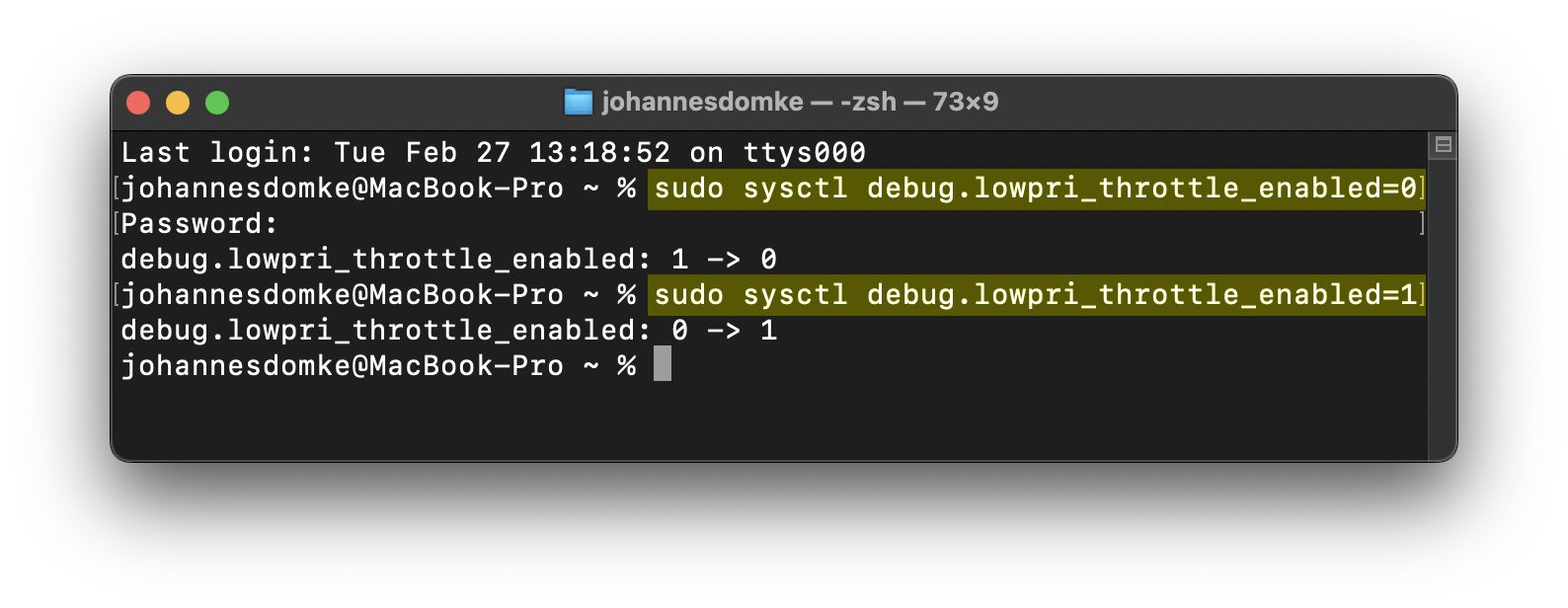 sudo sysctl debug.lowpri_throttle_enabled=0