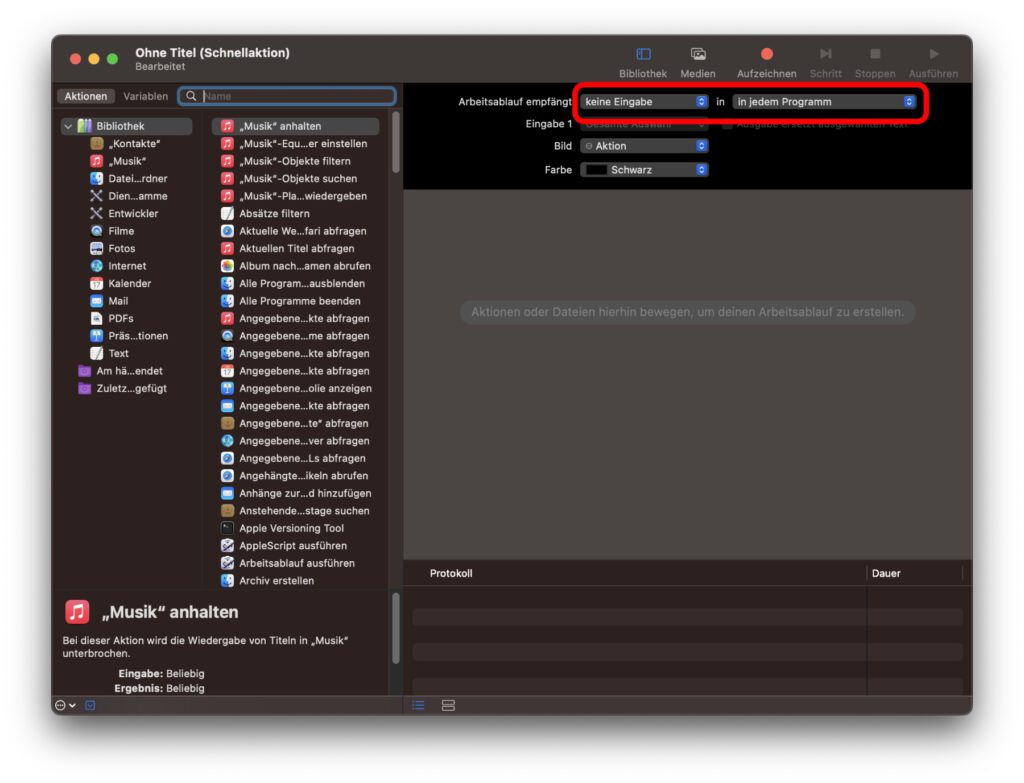 Als erstes konzentrieren wir uns nun auf den Arbeitsbereich auf der rechten Seite des App-Fensters. Dort wählen wir neben „Arbeitsablauf empfängt aktuelle(n)“ die Option „keine Eingabe“ aus. Daneben wählen wir im „in“-Dropdown-Menü den Punkt „in jedem Programm“ aus.