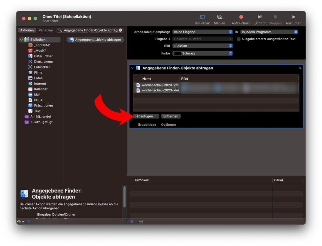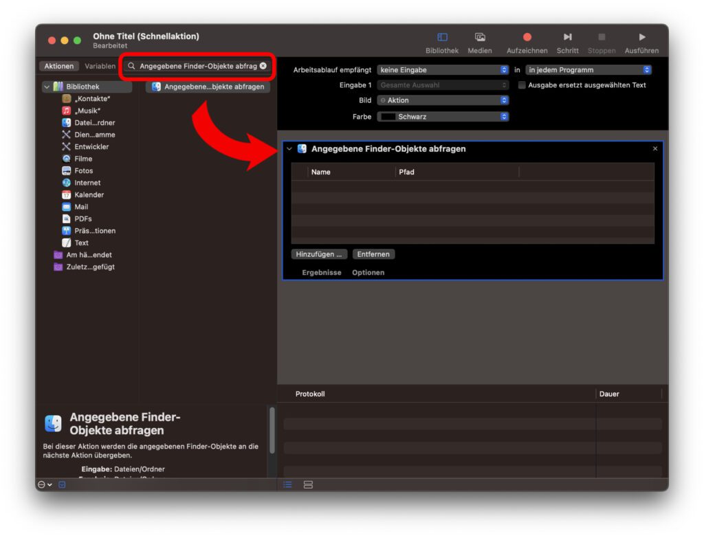 Jetzt geben wir links bei aktiviertem „Aktionen“-Reiter in der Suchleiste „Angegebene Finder-Objekte abfragen“ (ohne Anführungszeichen) ein und ziehen das Suchergebnis in den Arbeitsbereich auf der rechten Seite. Alternativ könnt ihr die Aktion auch aus der Liste aller Optionen heraussuchen, aber das dauert ggf. länger.