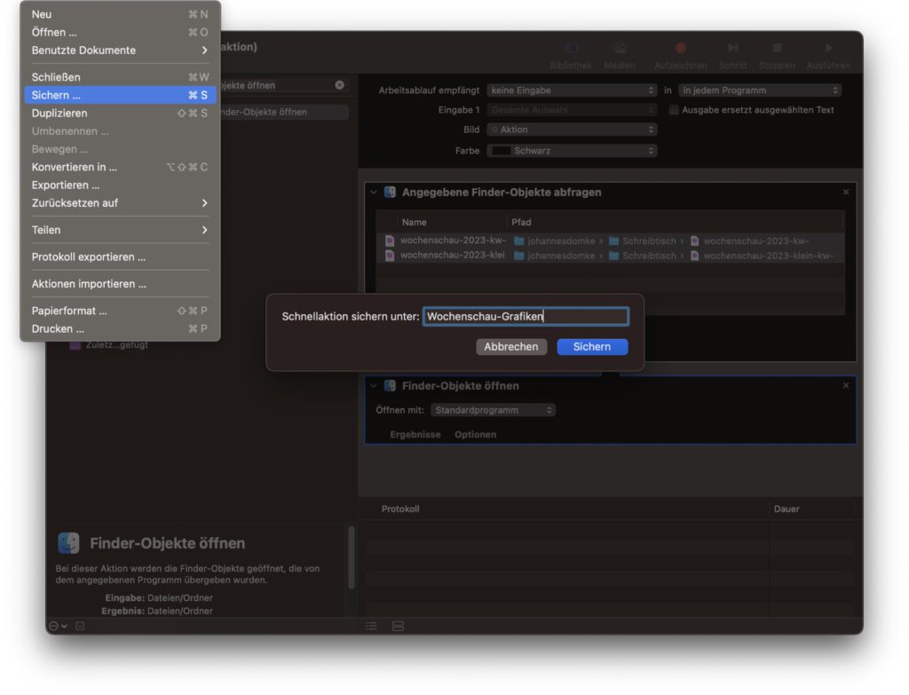 Die nötigen Schritte im Automator sind nun gegangen. Die Tastenkombination wird dann in den Systemeinstellungen festgelegt. Zuvor muss aber die gerade erstellte Schnellaktion noch gespeichert werden. Klickt dazu in der Menüleiste auf „Ablage“ und in diesem Dropdown-Menü dann auf „Sichern…“ (oder nutzt die Tastenkombination ⌘S). Vergebt anschließend einen wiedererkennbaren Namen für die Schnellaktion und speichert sie.