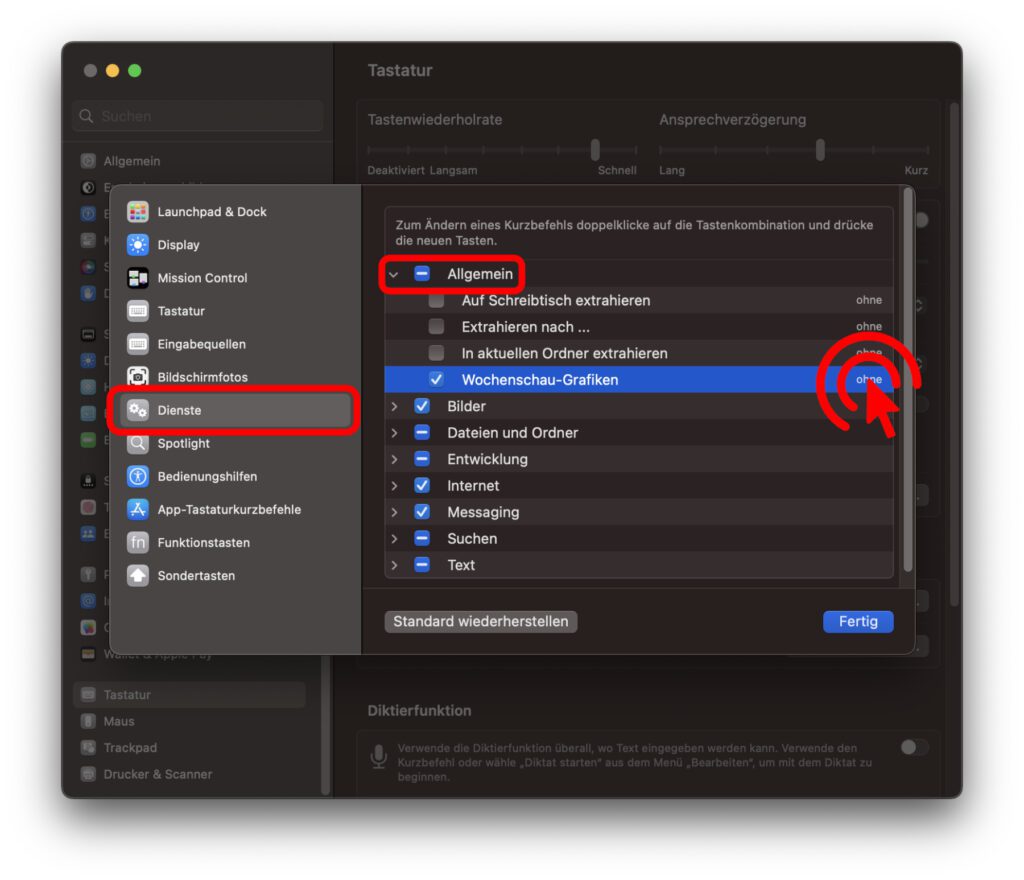 - Ab macOS 13 Ventura: Öffnet über das -Symbol in der Menüleiste die Systemeinstellungen, klickt in der linken Liste von Einstellungsbereichen auf Tastatur, und anschließend auf der rechten Seite auf den „Tastaturkurzbefehle…“-Button. Im sich öffnenden Fenster wählt ihr links Dienste aus und öffnet rechts die „Allgemein“-Übersicht.