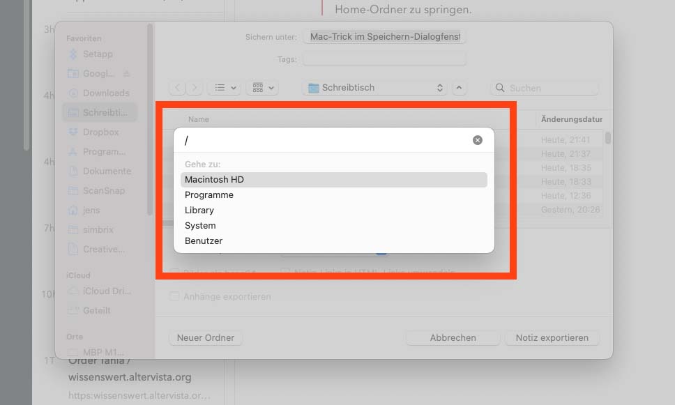 Und es gibt noch einen guten Tipp: Wenn man per Drag-and-drop einen Ordner aus einem Finder-Fenster auf den Speicherdialog zieht, so wird dieser als Ziel zum Speichern ausgewählt. Das funktioniert auch im Öffnen-Dialogfenster. Zudem kann man beim Öffnen auch direkt eine Datei ins Fenster ziehen und diese wird dann zum Öffnen markiert und kann mit einem Klick geöffnet werden.