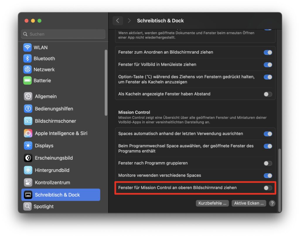 - Die Option Fenster für Mission Control an oberen Bildschirmrand ziehen deaktivieren
