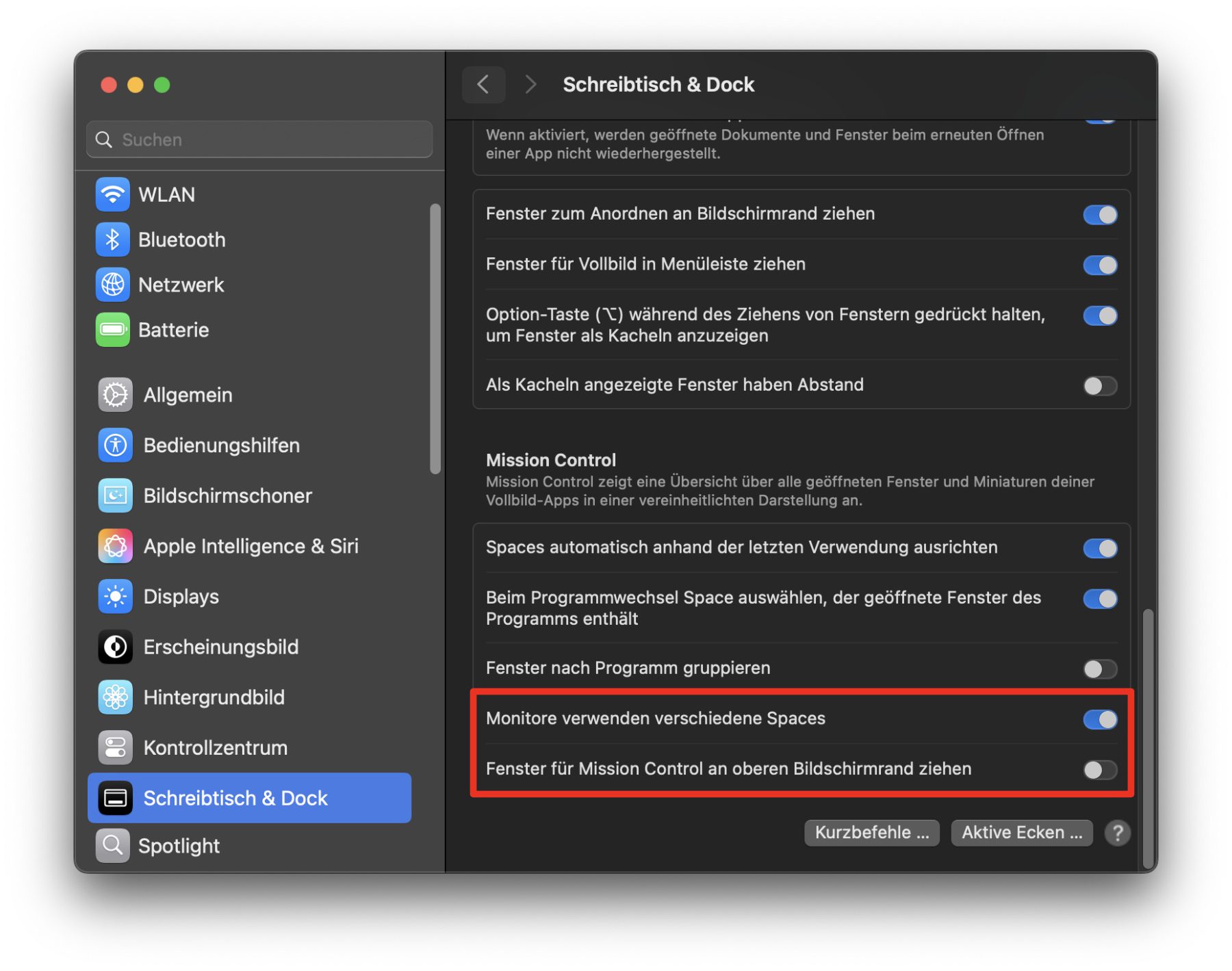 „Monitore verwenden verschiedene Spaces“ ist Voraussetzung für Window Tiling