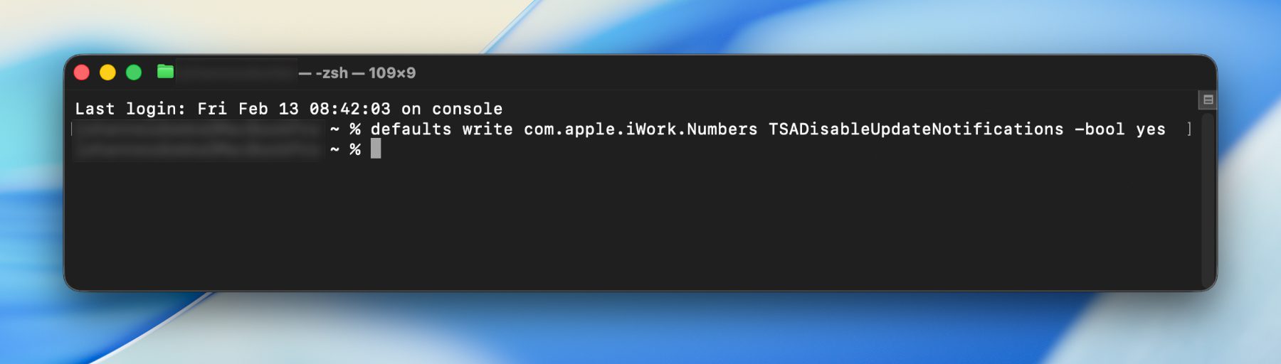 defaults write com.apple.iWork.Numbers TSADisableUpdateNotifications -bool yes