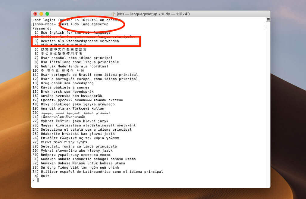 Hat man sudo languagesetup eingegeben, muss man den Befehl mit dem Administrator-Zugang bestätigen. Daraufhin erscheint eine lange Liste mit verfügbaren Sprachen, wobei Deutsch die Ziffer 3 zugeordnet ist. Nach dem Neustart des Mac sollten alle Dialoge und Buttons auf Deutsch erscheinen.