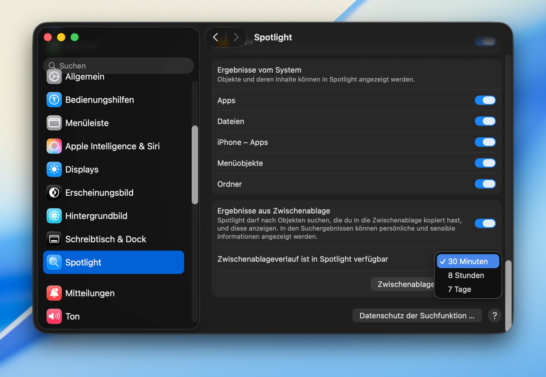 Unter macOS 26.0 konnte lediglich die Zwischenablagesuche von Spotlight aktiviert oder deaktiviert werden. War die Option eingeschaltet, dann hat der Mac die Inhalte der Zwischenablage für jeweils 8 Stunden aufbewahrt. So konnten sie über Spotlight gefunden werden.