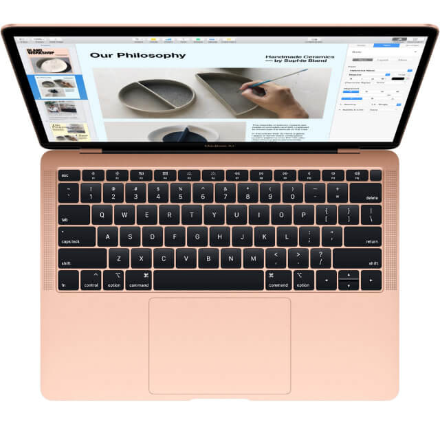 Das Apple MacBook Air 2018 mit 13,3“ Retina-Display hat eine Bildschirmdiagonale von 33,78 cm. Das Seitenverhältnis misst 16:10. Das Aluminium-Gehäuse ist nicht nur aus 100% recyceltem Metall, sondern kommt in drei Finishes daher: Gold, Silber und Space Grau. Weitere technische Daten und Details zur Ausstattung habe ich euch in der folgenden Liste zusammengefasst: