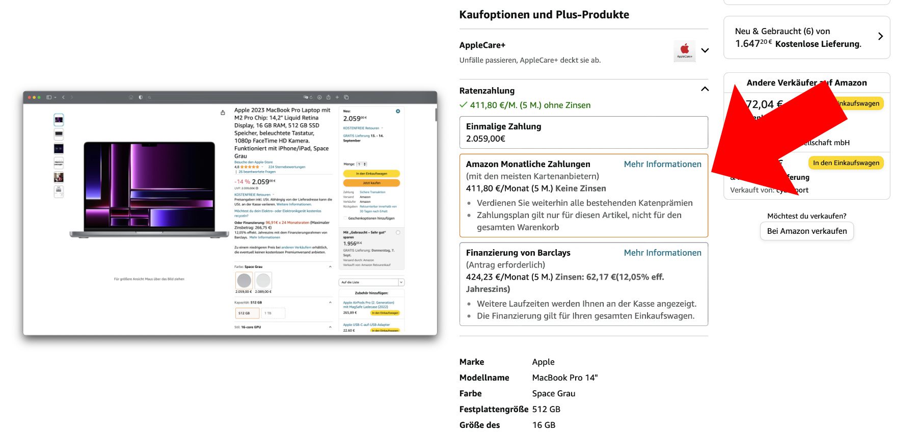 Wenn ihr gewisse Voraussetzungen erfüllt (s. u.), dann könnt ihr auf der Amazon-Produktseite teurer Geräte die Zahlung in fünf Monatsraten auswählen. Das habe ich euch zuletzt schon für das iPhone 14 (Pro), für aktuelle Modelle der Apple Watch sowie für das MacBook Air aufgezeigt. Und auch für das MacBook Pro ist die Finanzierung ohne Zinsen möglich. So kostet das 14-Zoll-Modell mit M2 Pro, 16 GB RAM und 512 GB SSD statt einmalig 2.059 Euro aufgeteilt lediglich 411,80 Euro pro Monat (Stand: 04.09.2023). Natürlich lassen sich auch andere Größen und Ausstattungen auswählen.