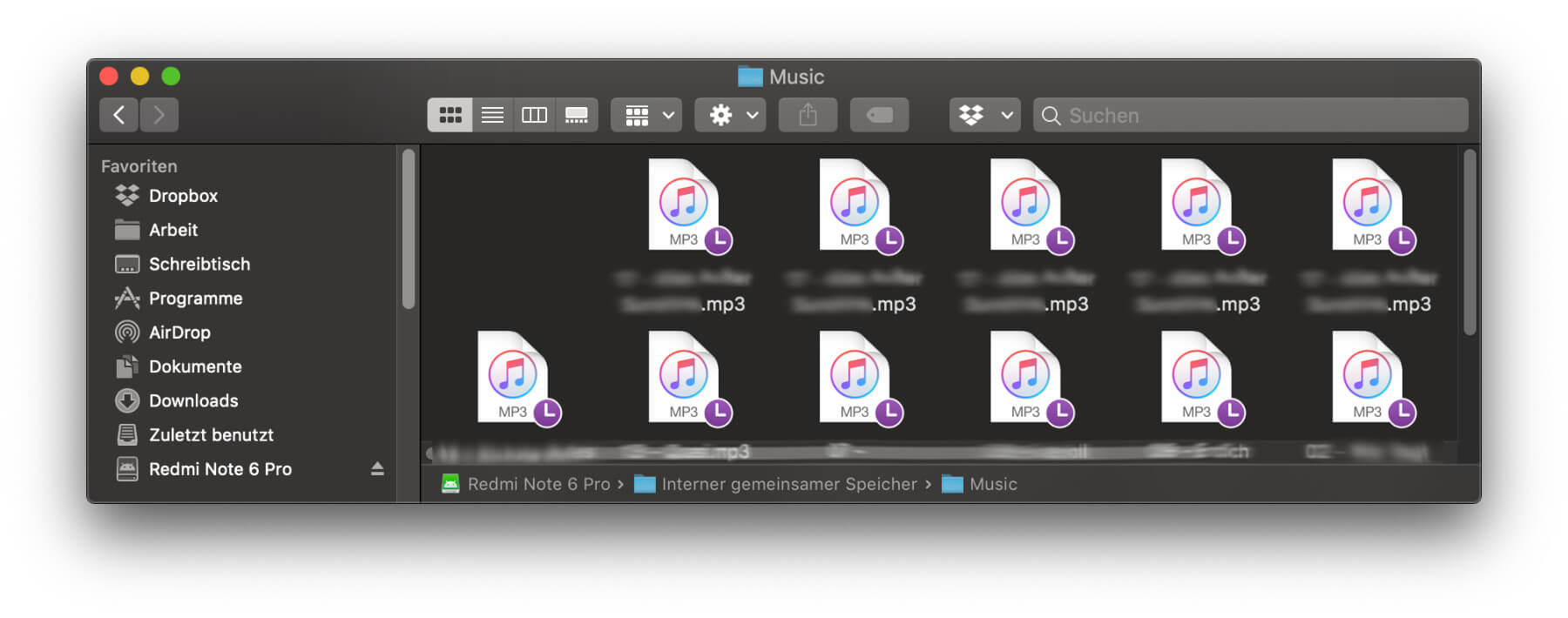 Beim Verbinden eines Android-Geräts (Xiaomi-Smartphone der Submarke „Redmi“) musste ich erst einmal auf dem Gerät selbst den Modus für die Datenübertragung wählen – aus Sicherheitsgründen kann man auch „nur Aufladen“ wählen. Anschließend wurde das Gerät auch in der Liste von MacDroid angezeigt: