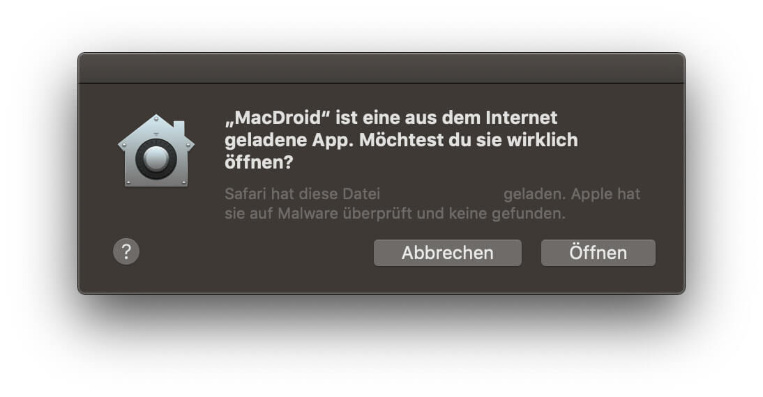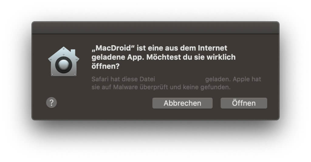 Der MacDroid Download von der oben verlinkten Seite funktioniert ohne Probleme. Ggf. muss man bestätigen, dass Safari (oder ein anderer Browser) Daten von der Seite runterladen darf. Die nun im Download-Ordner liegende macdroid.dmg ist nur 16,4 MB groß und wird per Doppelklick gemountet; dann ist nur noch die App in den Programme-Ordner zu ziehen.