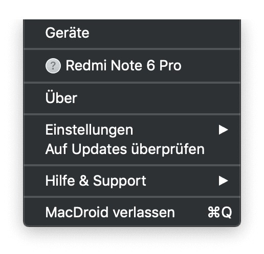 Erst nach meinem eigentlichen Test ist mir aufgefallen, dass MacDroid PRO auch noch ein Symbol in die Menüleiste setzt. Klickt man da drauf, findet man die wichtigsten Optionen der App als Dropdown-Menü:
