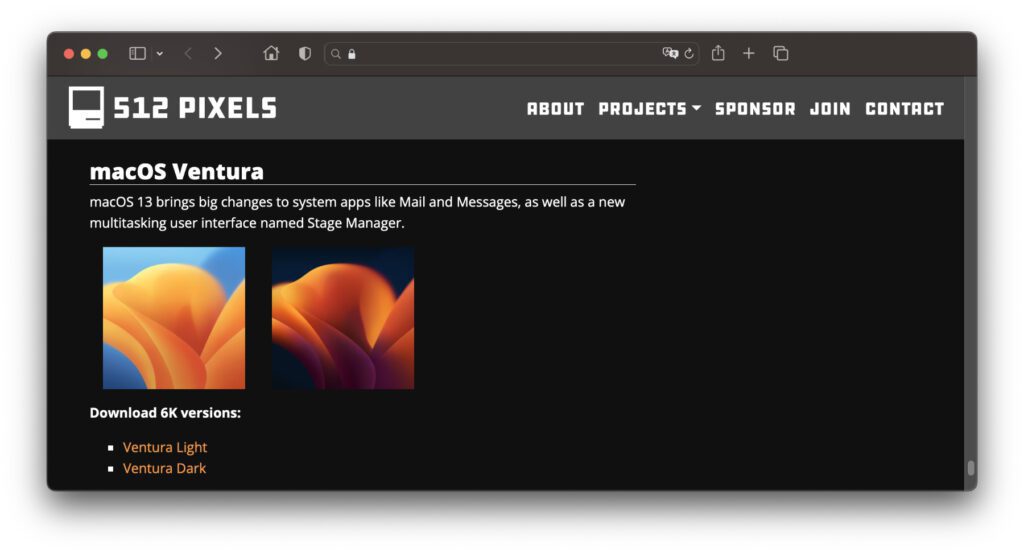 Eine Übersicht aller markanten Schreibtischhintergründe des Mac findet ihr übrigens bei 512pixels. Auf der Seite gibt es neben der Wallpaper-Sammlung noch einige weitere Projekte, die sich teilweise ebenfalls um Apple-Produkte bzw. Apple-Software drehen. Interessieren euch aber erst einmal nur die macOS Ventura Wallpaper als 6K-Download, dann nutzt gern diesen Link als Abkürzung zu der entsprechenden Unterseite. Der Download ist natürlich kostenlos und es wird keine Anmeldung vorausgesetzt.