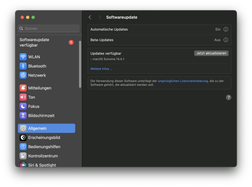 Ihr findet die Möglichkeit zur manuellen Installation in den Mac-Systemeinstellungen. Klickt dazu einfach oben links in der Menüleiste auf das Apple-Logo, in dessen Menü auf Systemeinstellungen… und dort in der linken Spalte auf Allgemein. Nun wählt ihr rechts Softwareupdate aus. Eventuell muss der Mac kurz abklären, ob ein Update verfügbar ist. Danach solltet ihr macOS 14.4.1 aber sehen und den „Jetzt aktualisieren“-Button klicken können.