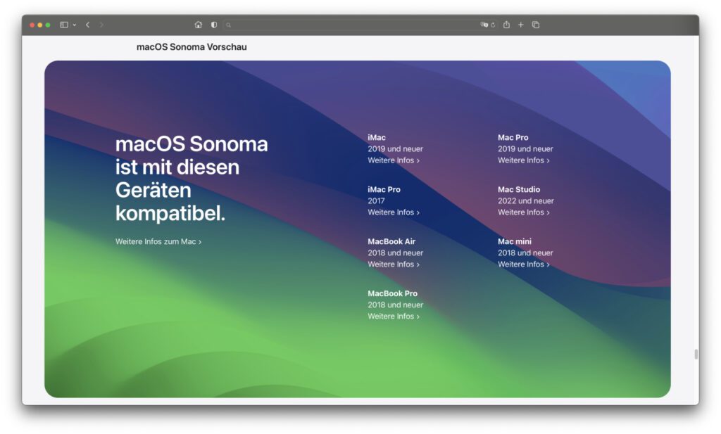 Details zum Thema findet ihr im Einzelbeitrag Ist mein Mac mit macOS 14 Sonoma kompatibel? Falls euer Mac in der verlinkten bzw. oben aufgezeigten Liste nicht genannt wird, dann habt ihr offiziell nicht die Möglichkeit, darauf das Upgrade für macOS 14 zu installieren. Es gibt zwar jedes Jahr sogenannte Patcher, die eine Installation auf älteren Macs ermöglichen. Durch die größere Konzentration auf M-Chips, deren ARM-Architektur sowie der Apple-eigenen Einbindung von CPU, GPU, RAM und Co. werden diese aber sicher mit der Zeit immer weniger für ältere Intel-Macs angeboten.