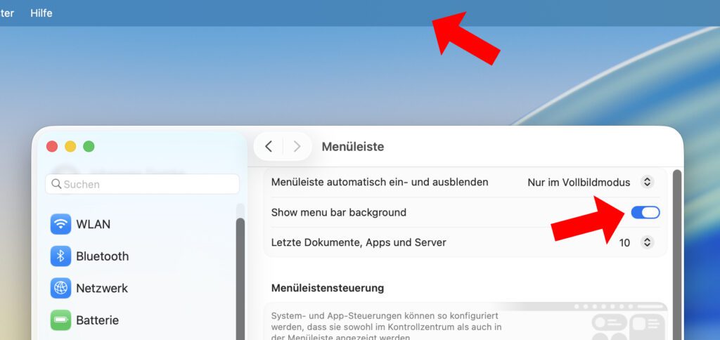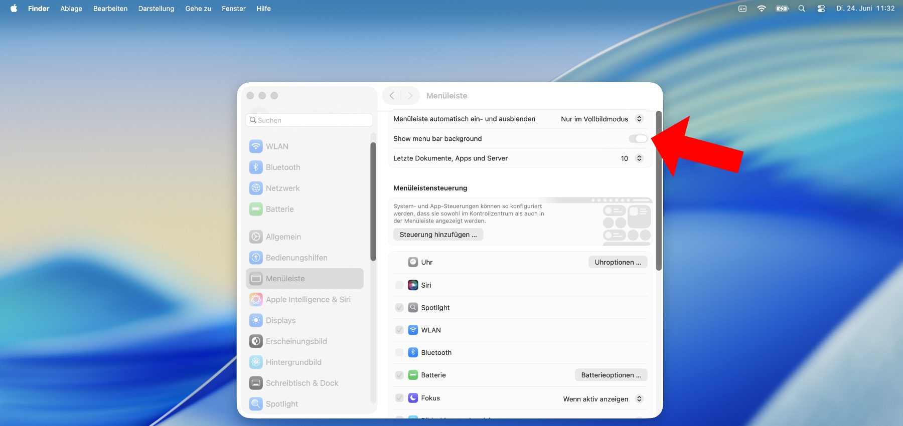 Ich habe mir die zweite Developer-Beta von macOS 26 Tahoe heruntergeladen, um mir die zwei beschriebenen Änderungen anzusehen. Unter Systemeinstellungen -> Menüleiste gibt es nun die noch nicht ins Deutsche übersetzte Option „Show menu bar background“ (Menüleistenhintergrund anzeigen).