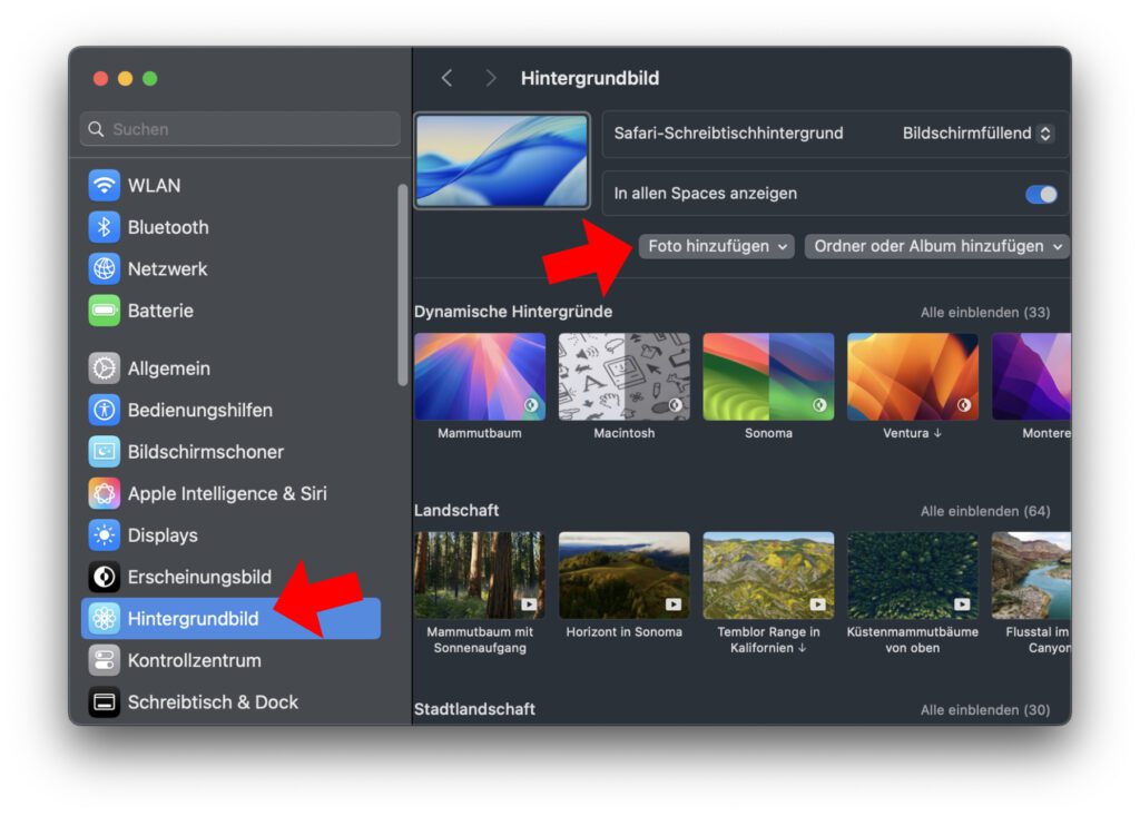 Um eine Bilddatei als Mac-Schreibtischhintergrund zu nutzen, ruft man die Systemeinstellungen auf, z. B. über das Apple-Menü oben links oder über das Launchpad. In den Systemeinstellungen wählt man in der linken Seitenleiste den Punkt „Hintergrundbild“. Um nun eine Datei zu wählen, klickt man den „Foto hinzufügen“-Button. Über diesen lassen sich einzelne Bilder aus Finder-Ordnern oder aus Alben der Fotos App importieren.