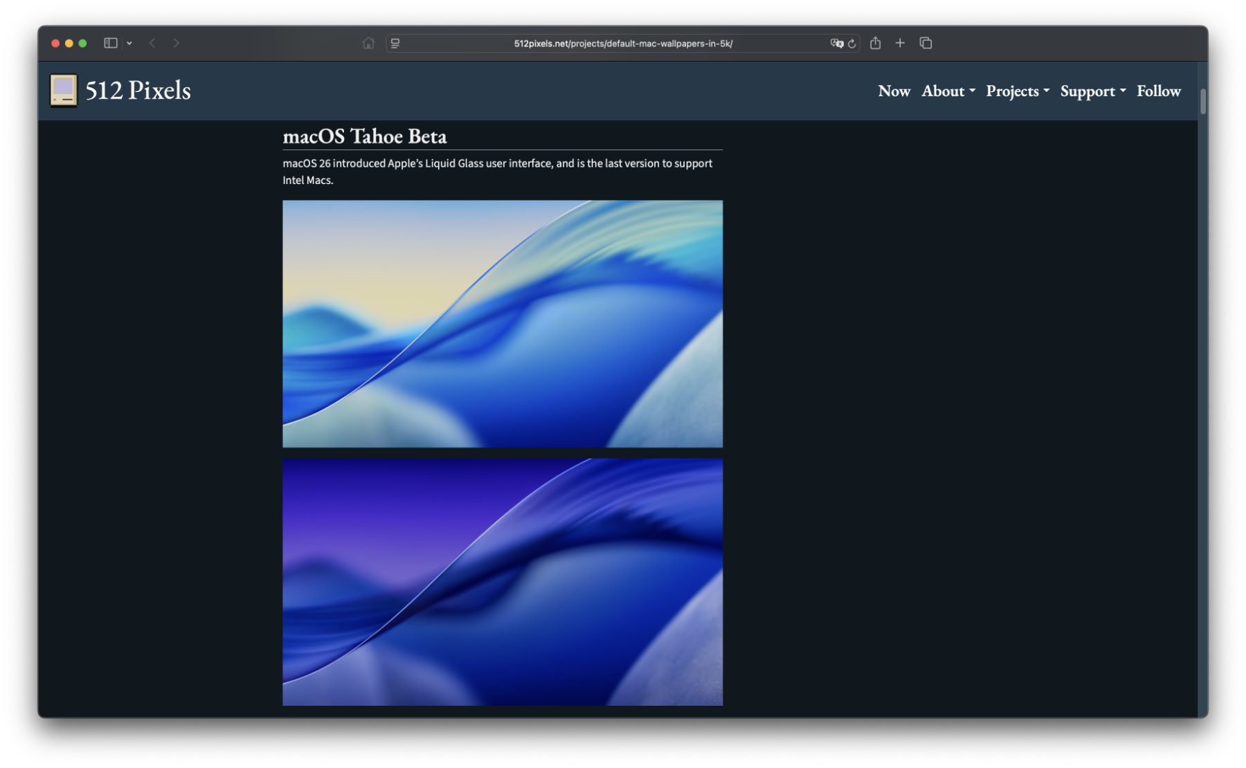 So können sogar die Hintergründe von über 20 Jahre alten Systemen auf neuen 5K- und 6K-Displays glänzen. Als neueste Zugänge findet man auf der Seite die Hintergrundbilder von macOS 26 Tahoe, zumindest jene aus der ersten Developer-Beta. Es ist aber anzunehmen, dass die Bilder bis zum Release der fertigen Version im Herbst nicht mehr abgeändert werden.