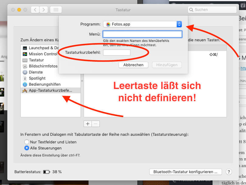 Das Ganze wäre ja noch zu ertragen, wenn man die Taste einfach neu belegen könnte, aber leider nimmt das Kontrollfeld "Tastatur" in den Systemeinstellungen unter App-Kurzbefehle für die Fotos-App keine Leertaste als neues Kürzel an. Das heißt, man kann sich vielleicht irgendeine neue Tastenkombination ausdenken, die funktioniert, aber das ist eben nicht die Leertaste, die man im kompletten Finder immer für die Schnellansicht von Dokumenten nutzen kann.