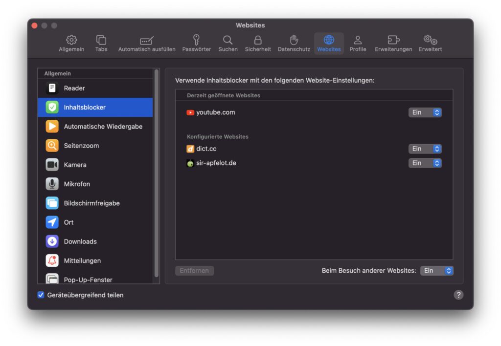 Ich konnte zwar in Safari -> Einstellungen… -> Websites -> Inhaltsblocker die neue Funktion „Hide Distracting Items“ für die aktuell aufgerufenen Webseiten ein- und ausschalten. Eine Übersicht der blockierten Elemente auf jeder Webseite gibt es dort aber nicht. Bisher konnte ich also nirgendwo eine Liste der Elemente einsehen, um einzelne davon wieder für die Anzeige freizugeben. Die einzigen Möglichkeiten zur Anzeige von aus Versehen blockierten Inhalten sind also, die Einstellungen zurückzusetzen oder den Inhaltsblocker zu deaktivieren. Ob Apple hier eine Einzelverwaltung nachreicht, ist fraglich.