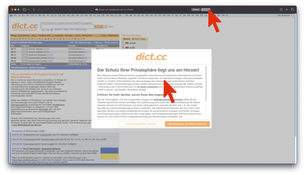 Anschließend lassen sich nun Elemente der aufgerufen Webseite aussuchen, die verschwinden sollen. Als Beispiel nutze ich hier mal den Cookie- und Datenschutz-Banner des Online-Wörterbuchs dict.cc. Ich habe diesen angeklickt und er wurde mit einem animierten Partikeleffekt aufgelöst. Abschließend darf man aber nicht vergessen, in der Adresszeile auf den Done- bzw. Fertig-Button zu klicken. Sonst werden die Änderungen nicht übernommen.