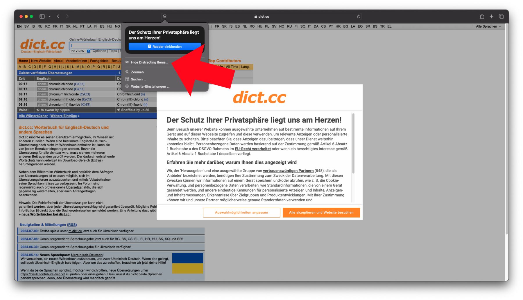 Anschließend lassen sich nun Elemente der aufgerufen Webseite aussuchen, die verschwinden sollen. Als Beispiel nutze ich hier mal den Cookie- und Datenschutz-Banner des Online-Wörterbuchs dict.cc. Ich habe diesen angeklickt und er wurde mit einem animierten Partikeleffekt aufgelöst. Abschließend darf man aber nicht vergessen, in der Adresszeile auf den Done- bzw. Fertig-Button zu klicken. Sonst werden die Änderungen nicht übernommen.