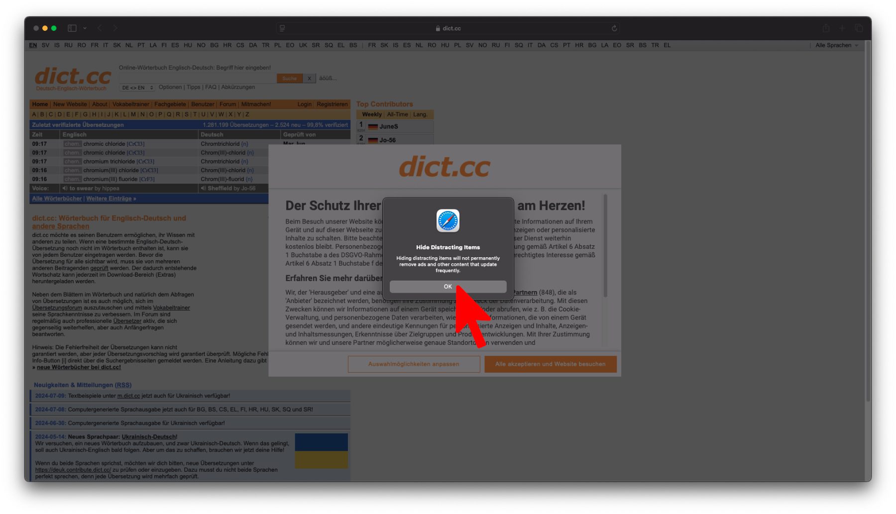 Klickt man diese Funktion, die ab der macOS 15 Beta 3 zu finden ist, das erste Mal an, dann erscheint ein Hinweisfenster. Dessen Text wurde auch noch nicht übersetzt, lässt sich allerdings in etwa so verstehen: „Das Verstecken von ablenkenden Elementen führt nicht zur dauerhaften Beseitigung von Werbung und anderen Inhalten, die regelmäßig aktualisiert werden.“ Hier muss man nun auf den OK-Button klicken, um fortfahren zu können.