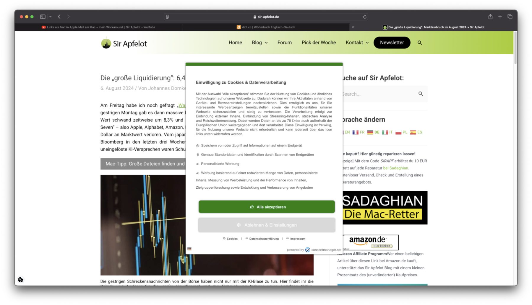 Während der Cookie- und Datenschutz-Banner bei dict.cc während der Nutzung verschiedener Übersetzungen und anderer Seitenbereiche ausgeblendet blieb, da war das auf anderen Websites nicht der Fall. Vor allem bei Blogs mit einer Startseite und verschiedenen Beiträgen sowie Unterseiten kam es vor, dass der Banner sich zwar auf einer Seite ausblenden ließ, nach dem Aufrufen eines Blogbeitrags aber wieder angezeigt wurde. Auch hier bei Sir Apfelot war das der Fall.