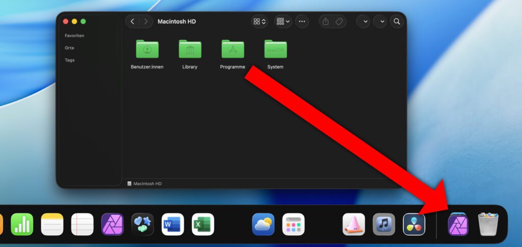 Ein Trick, um die auf dem Mac installierte Software wieder in einer größeren Übersicht anzeigen zu lassen, besteht in der Ablage des Programme-Ordners auf dem Dock. Dazu wird im Finder die Macintosh HD geöffnet und der Programme-Ordner mit der Maus auf die rechte Seite des Docks gezogen, links neben den Papierkorb.