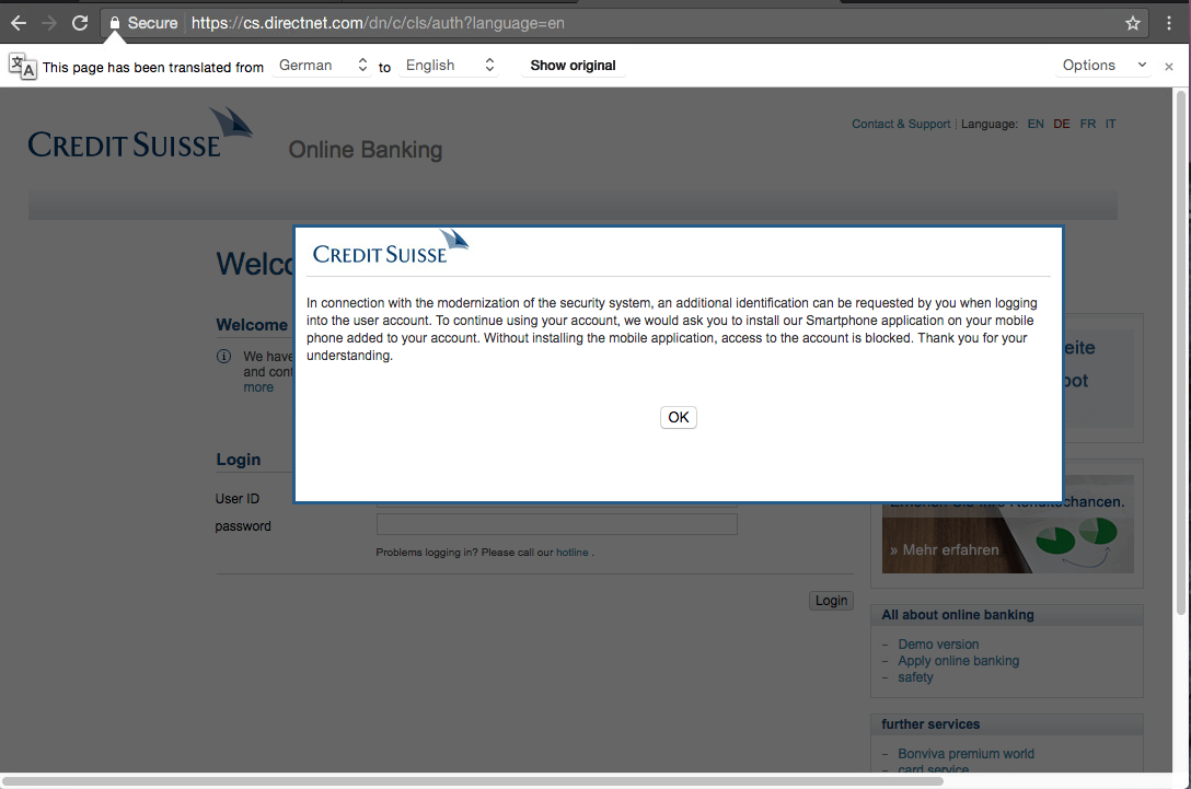 Im verlinkten Beitrag von Check Point findet ihr eine umfangreiche Darstellung der gefälschten Seite, die aufgrund der OSX/Dok Schadsoftware angezeigt wird, wenn das Opfer Online Banking per Credit Suisse betreiben möchte. Diese Bank ist dabei nur ein Beispiel, da neben Banken der Schweiz, Deutschland und Österreich auch andere Banken-Seiten aus Europa betroffen sind / sein können. Auf der gefälschten Seite bekommt man jedenfalls einen Hinweis zur „Modernisierung des Sicherheitssystems“ angezeigt und wird aufgefordert, die mobile Applikation zu installieren: