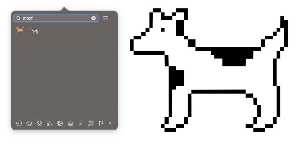 Weiter oben habe ich euch schon zwei eindeutige Easter Egg Emojis aus macOS und weiteren Apple-Betriebssystemen gezeigt. Doch habt ihr im Emoji-Suchfeld schon einmal statt „Hund“ oder „Kuh“ die Begriffe „Clarus“ oder „Moof“ eingegeben? Mit diesen erhaltet ihr gleichzeitig einen Hunde- und einen Kuh-Emoji. Warum? Weil Clarus die Hundekuh in den 1980ern in das Apple- bzw. Macintosh-Betriebssystem eingefügt wurde. Sie zeigte die Seitenausrichtung von Dokumenten an, die gedruckt werden sollten (ganze Geschichte hier).