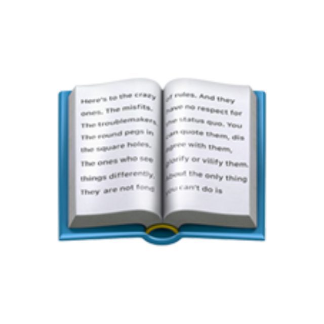 Aber auch in systemübergreifenden Symbolen gibt es Querverweise auf diesen Text. Denn zwar sind Emojis und ihre allgemeine Bedeutung für macOS, Windows, Android, iOS, Linux und Co. standardisiert. Die genaue Gestaltung der einzelnen Bildchen obliegt aber den einzelnen Firmen, die das jeweilige System anbieten. Und so kann man den „The Crazy Ones“-Anfang auch in einem der Buch-Emojis von Apple finden.