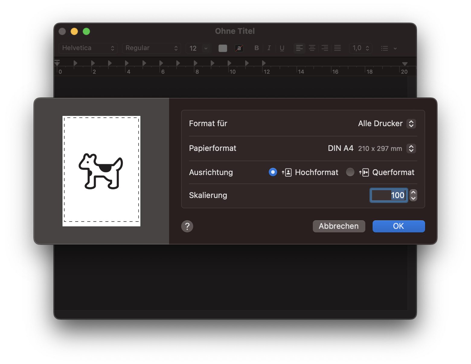 Lange Zeit war sie nicht mehr in Mac OS, OS X oder macOS zu finden. In macOS Ventura (das aktuelle Mac-Betriebssystem) ist sie aber zurück. Zwar wird die Grafik nicht mehr so pixelig, sondern eher abgerundet angezeigt, man findet sie aber trotzdem noch, wenn man z. B. in Pages, dem TextEditor oder einem ähnlichen Programm im „Ablage“-Menü auf „Papierformat…“ klickt.