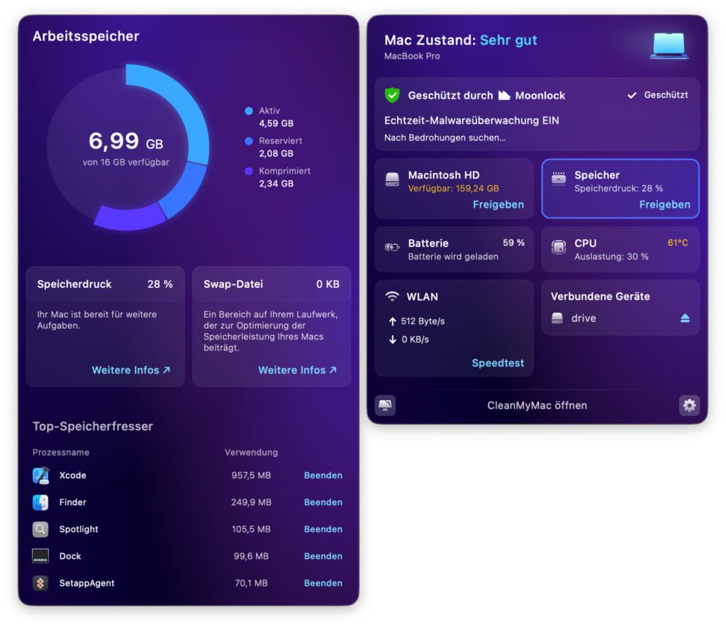 - CleanMyMac Menü: Das neue CleanMyMac bringt außerdem eine überarbeitete Menüleisten-Ansicht mit. Hier können mit nur ein-zwei Klicks die Hintergrund-Scans und Systemwerte eingesehen werden, um die Ressourcen des Mac einfacher verwalten zu können. Auch der Malware-Scan und die Laufwerk-Überwachung sind hier einsehbar, nebst dem Energieverbrauch, den verbundenen Geräten und mehr.