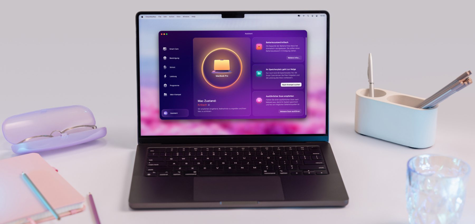 - Assistent: Hier können personalisierte Berichte abgerufen, der allgemeine Zustand des Mac eingesehen, maßgeschneiderte Vorschläge für die Bereinigung angewendet und Erinnerungen für Wartungen eingerichtet werden.