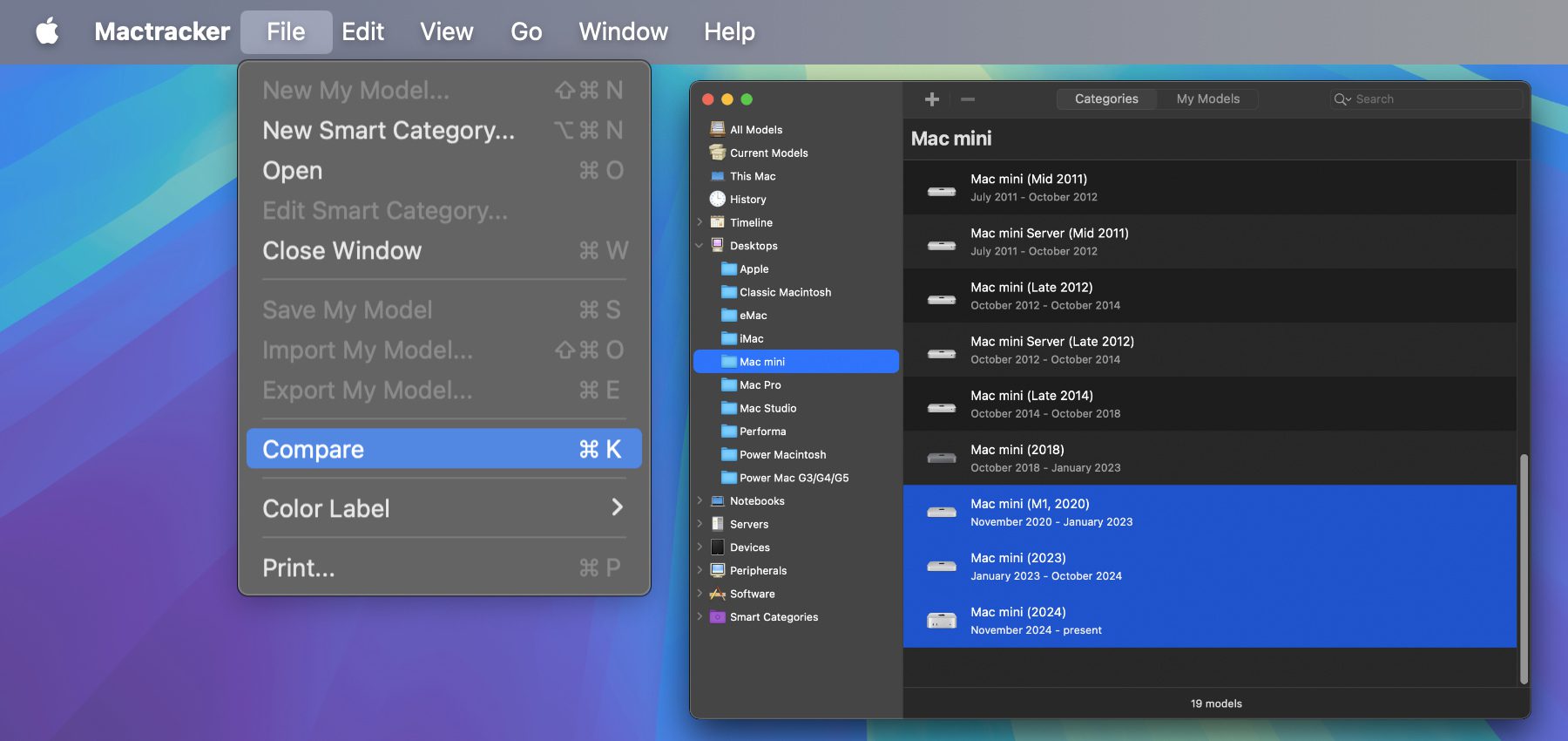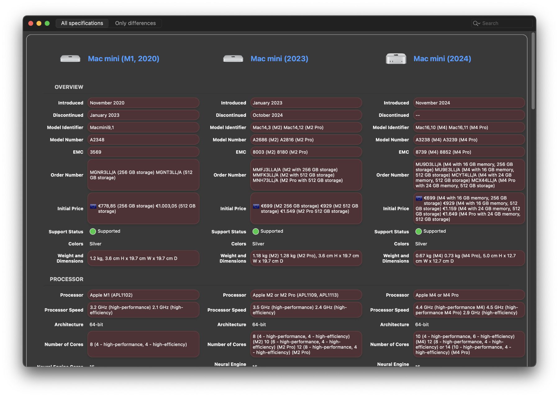 Darüber hinaus kann die Mactracker App sogar beim Kauf eines neuen Mac, iPhone, iPad oder eines anderen Apple-Geräts helfen. Denn es gibt eine Vergleichsoption, mit der man verschiedene Modelle einer Produktfamilie gegenüberstellen kann. Im „Categories“-Tab markiert man dafür die zu vergleichenden Geräte (Shift halten und Modelle anklicken) und wählt dann in der Menüleiste File -> Compare aus. So lassen sich die Gemeinsamkeiten und Unterschiede der Geräte anzeigen. Der Tab „Only differences“ zeigt sogar nur die Unterschiede.