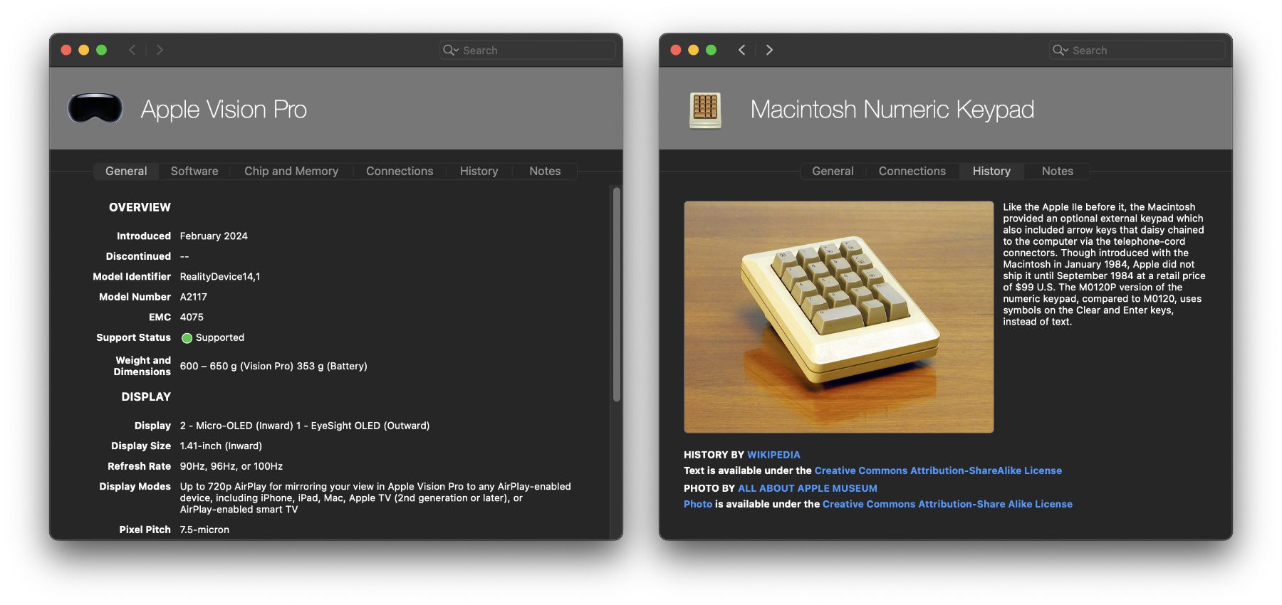 Die hier im Blog schon oftmals empfohlene Mactracker App für Mac, iPad und iPhone hat vor ein paar Tagen wieder mal ein Update abbekommen. Dieses hat aber nicht nur dafür gesorgt, dass das Apple-Lexikon die Einträge für die Vision Pro und visionOS bekommen haben. Auch eine in 1984 vorgestellte optionale Peripherie für den Macintosh (der letztens sein 40-jähriges Jubiläum feierte) wurde nun mit aufgenommen. Nicht zuletzt spendierte der Entwickler Ian Page seinem kostenfrei angebotenen Programm noch ein paar Infos zu aktuellen Betriebssystemupdates.