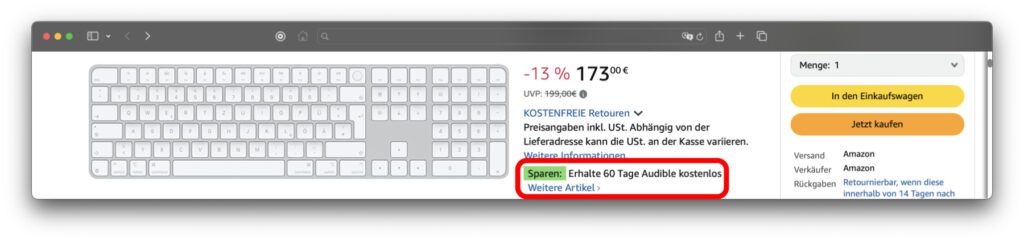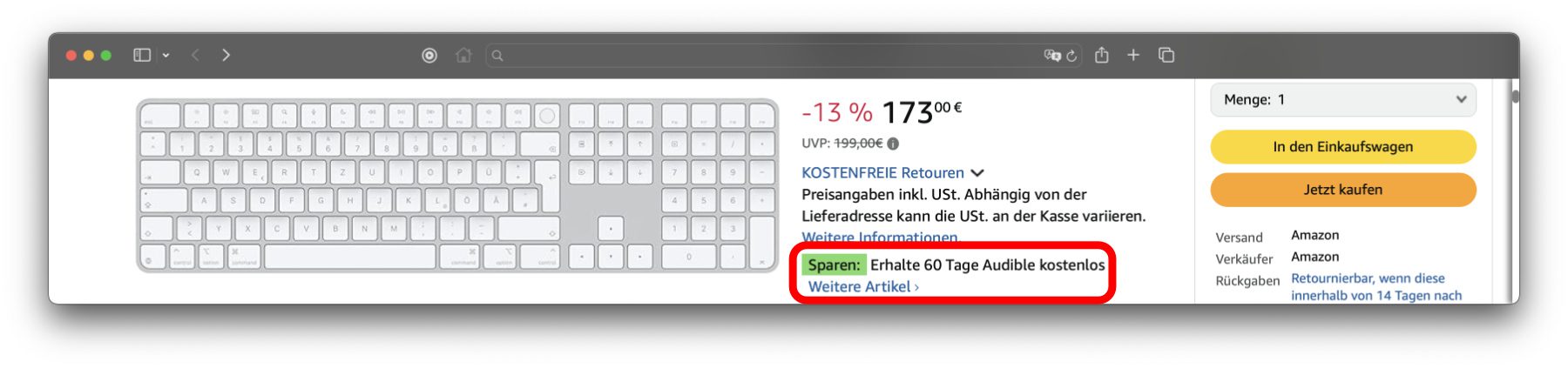 Auf den Produktseiten der Magic Mouse und des Magic Keyboards ist derzeit der Hinweis „Erhalte 60 Tage Audible kostenlos“ zu finden. Das Angebot richtet sich dabei an Neukund/innen von Audible (oder auch bisherige User, die in den letzten zwölf Monaten kein reguläres, Probe- oder Aktions-Abo hatten) und besteht aus einem 60-Tage-Probeabo. Dieses muss manuell gekündigt werden, damit es nach Ablauf nicht in ein Abo für 9,95€ pro Monat übergeht.