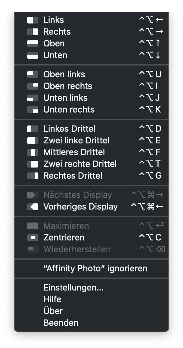 Denn die Magnet App lässt sich nach der Installation auf der Menüleiste von macOS nieder. Klickt man das Magnet-Symbol an, wird eine Liste von Anordnungsoptionen und Einstellungen aufgezeigt. Neben den einzelnen Befehlen bzw. Positionen für das gerade aktive Fenster steht dabei immer die jeweilige Tastenkombination, sodass ihr auf Dauer die einzelnen Positionen-Shortcuts lernen und die App noch effizienter einsetzen könnt.