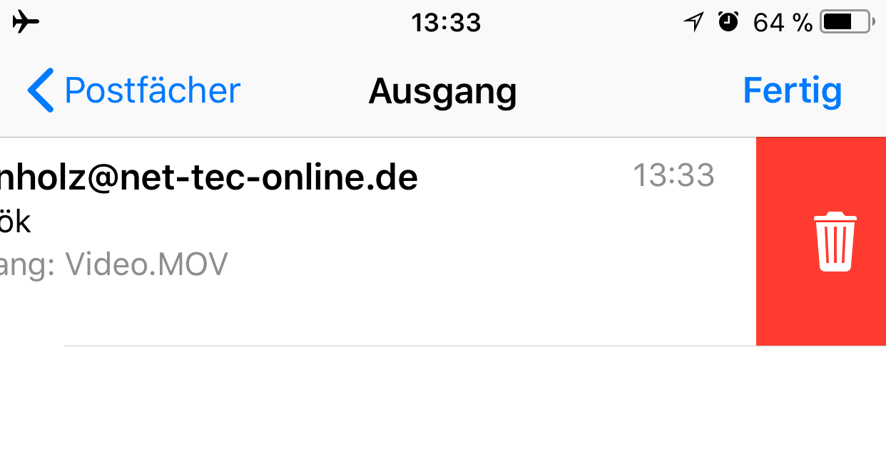 Heute hat mich eine Leserfrage von Claus erreicht, der ein Problem mit einer großen Mail im Postausgang (Outbox) hatte, die weder verschickt wurde noch gelöscht werden konnte. Sie steckte einfach dort fest. Das Löschen funktionierte nicht, da das iOS Mailprogramm am iPhone die Mail immer wieder in Verwendung hatte, um sie zu versenden, was aber aufgrund der Größe (es hing ein Riesen-Video an) nicht funktionierte. Im Postausgang wurde neben der Mail immer ein drehender Kreis angezeigt, und das nach links Wischen, um das Löschen zu initiieren, wurde nicht von iOS umgesetzt.