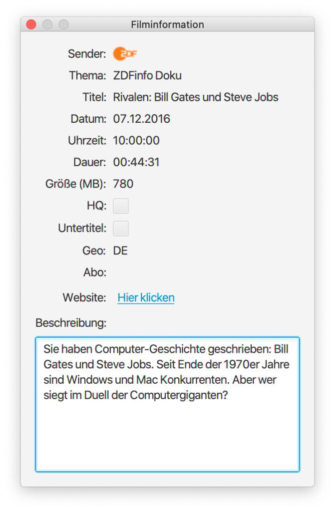 Klickt ihr doppelt auf einen Titel, dann werden euch weitere Informationen geboten – etwa ob es eine Version in hoher Auflösung (HQ) gibt, ob Untertitel zur Verfügung stehen und so weiter. Außerdem gibt es eine Beschreibung, also eine Art kleinen Klappentext, der noch einmal detaillierter auf den Inhalt der ausgesuchten Sendung eingeht. Was in meinem Kurztest nicht funktioniert hat, war die Wiedergabe über den Play-Button. Aber das lässt such durch einen Klick auf den Link zur Mediathek lösen. Funktioniert hat allerdings die Download-Funktion (s. u.).