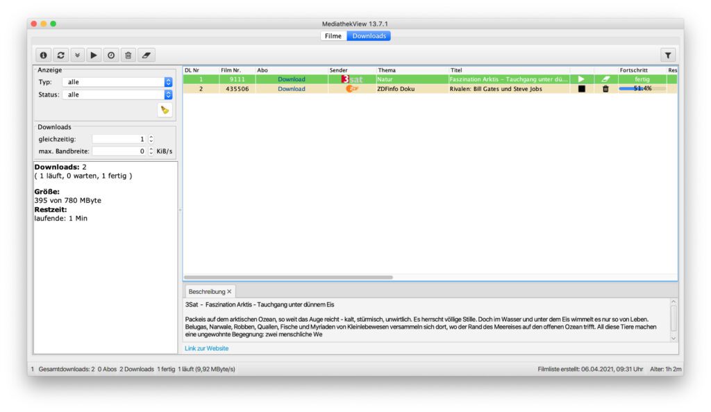 Wie oben schon aufgezeigt, habt ihr mit der MediathekView App unter macOS am Apple Mac, am Windows-PC sowie an der Linux-Maschine nicht nur die Möglichkeit, Sendungen, Dokus und Beiträge von öffentlich-rechtlichen Sendern zu suchen. Über die App lassen sich selbige auch aus der Mediathek herunterladen, damit ihr sie lokal auf der Festplatte ablegen und später offline ansehen könnt. Praktisch ist dabei der Reiter Downloads in der App, der zur Download-Übersicht und -Verwaltung führt.