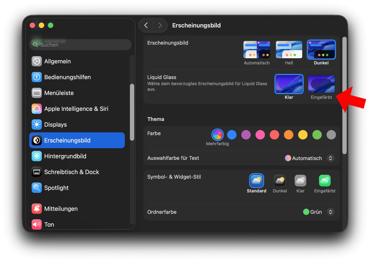 Liquid Glass einfärben am Mac – im Dunkel-Modus.