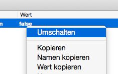 - Es erscheint nur noch eine einzige Zeile. Dort macht man einen Rechtsklick auf den Wert "false" und wählt "Umschalten". Danach sollte dort "true" erscheinen.