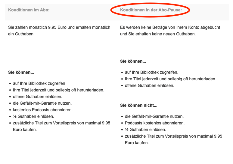 Audible bietet die Möglichkeit nach einer gewissen Nutzungsdauer des Angebots das Abonnement für 3 Monate zu pausieren. So muss man es nicht kündigen und sich dann wieder neu registrieren – und man behält seine Bibliothek in einem Nutzerkonto bei. Eine kleine Kritik meinerseits ist dabei, dass man nur alle paar Monate pausieren kann und dass das mit einigen Einschränkungen einhergeht. Um die Pause zu starten, schreibt man dem Kundenservice. Folgende Vorteile gelten während der Abo-Pause nicht: